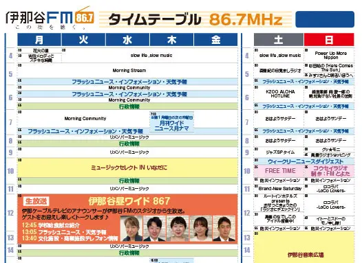 伊那谷FMラジオは、自然の音と人々の心の声を大切にし、共に歩んでいく放送局です。私たちは、地域の声に真摯に耳を傾け、生活に必要な情報をお届けいたします。
